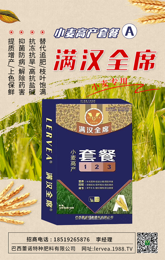 3、抓住小麥返青拔節(jié)的有利時機,及時采取促控措施,促進弱苗轉化,提高成穗率;控制旺長田塊,預防后期貪青倒伏。今天,小編為大家?guī)硪豢畎臀骼僦Z特種肥料有限公司的產品--小麥高產套餐A,能夠補充小麥生長的各種營養(yǎng)、調節(jié)小麥長勢,提高小麥抗病能力,為小麥高產保駕護航!